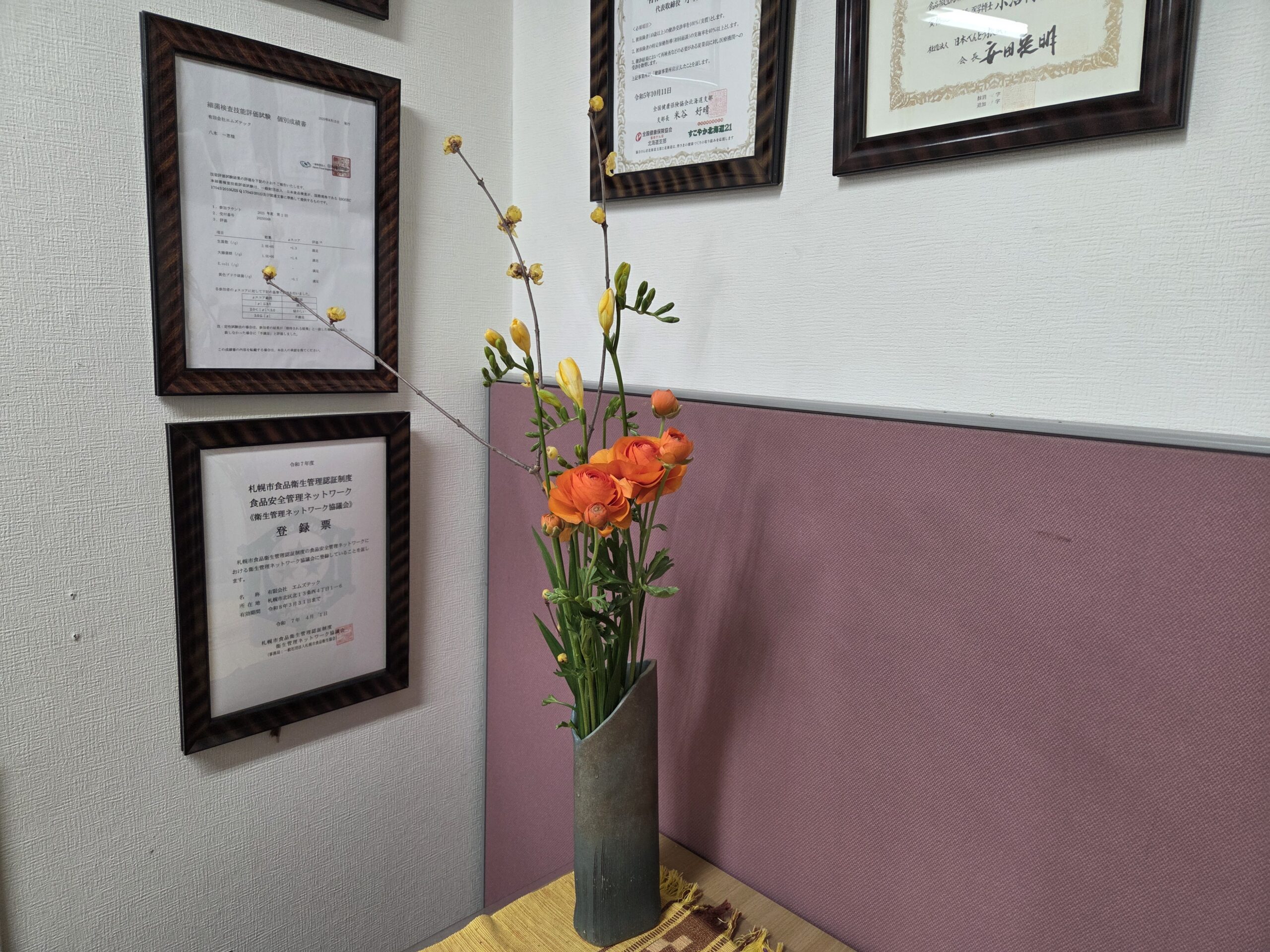 大分春めいてきました。今週のメインは黄色のロウバイとフリージア。それにアクセントでオレンジのラナンキュラスです。ちょっとシンプルにスッキリ活けてみました。