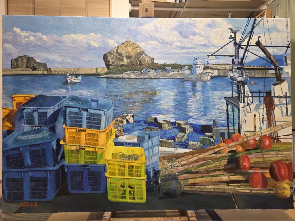 以前にも投稿したかと思いますが、私の趣味は油絵を描くことで、中学から描いて20歳で一度筆を置いた油絵を7年前からまた描き始め、北海道の公募展である道展に4年前から出品して、お陰様で4年連続入選しております。表題の写真は今年の作品で、生まれた故郷の漁港の風景です。
