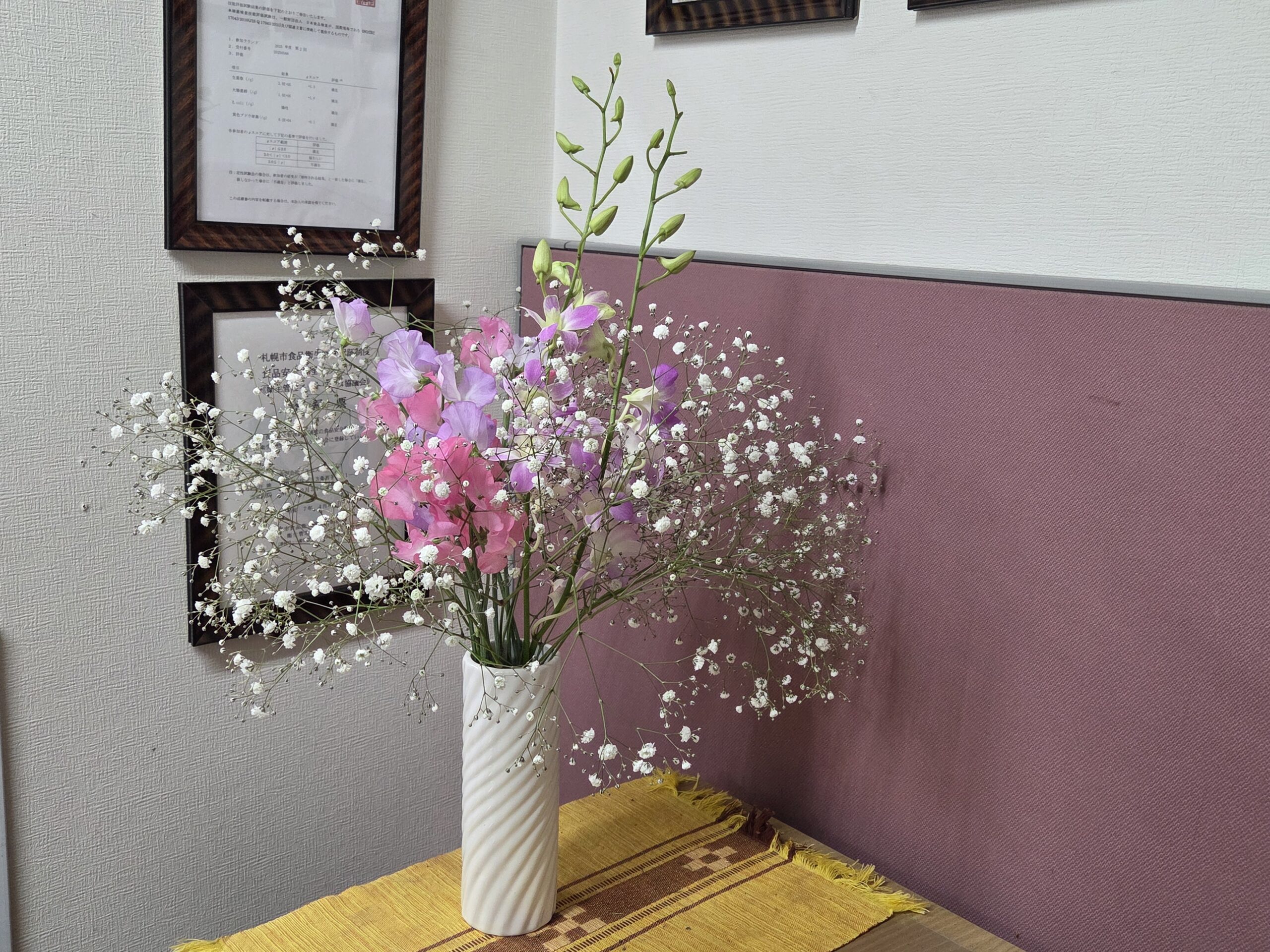 雪が舞う中に咲くスイートピーのイメージで今週は皆様をお出迎えします。